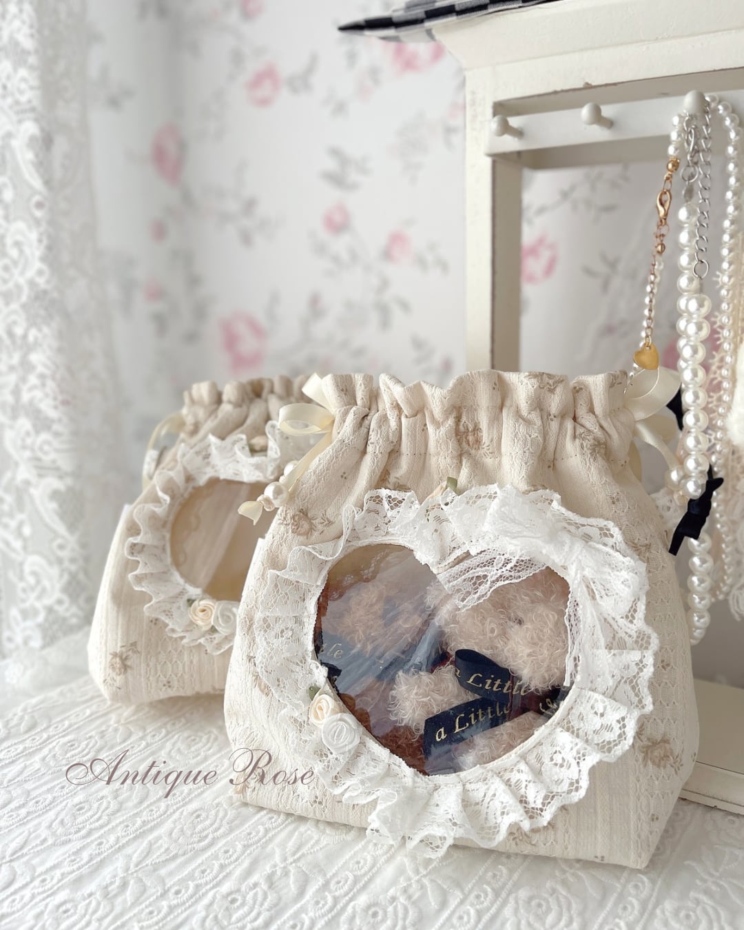 推しグッズ フレンチガーリー ロマンティック ホワイト 白 アンティーク風 クラシカル ドーリー バレエコア 大人ガーリー 巾着バッグ 巾着ポシェット ハンドメイド 日本製 手作り 布小物 アイドル アニメ キャラクター ぬい撮り オタ活 ヲタク