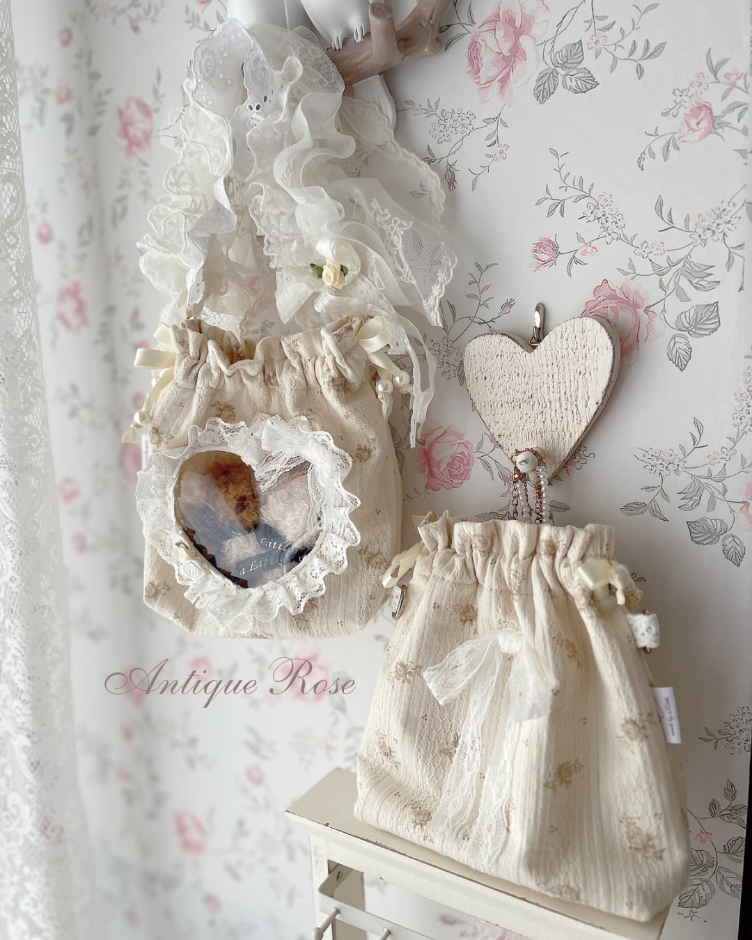 窓がある面には、ローズモチーフとレースリボンを添えて